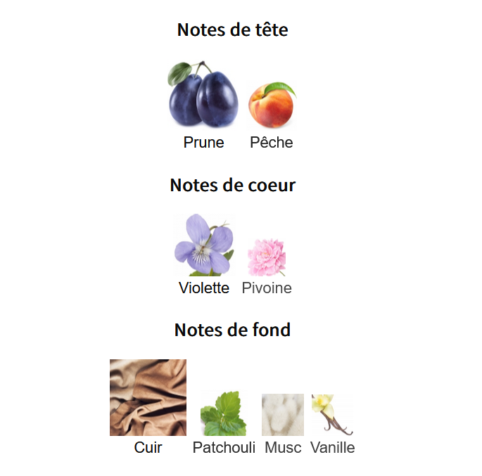 - Base notes : Leather, Vanilla, Musk, Patchouli