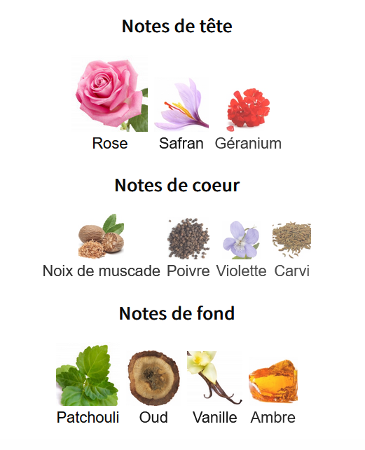- Notes de fond : Patchouli, Vanille, Bois d'agar (Oud), Ambre