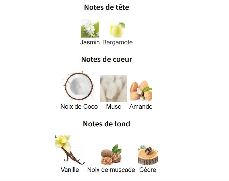 Notes de Cœur : Au cœur de la fragrance, la richesse crémeuse de la noix de coco se mêle parfaitement à la chaleur du musc et à la douceur de l'amande, offrant une sensation douce et indulgente.