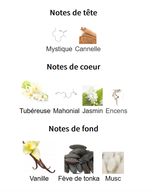 - Notes de cœur : Jasmin, tubéreuse, encens, mahonial