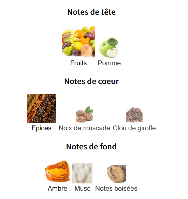- Notes de cœur : Épices, Noix de muscade, Clou de girofle