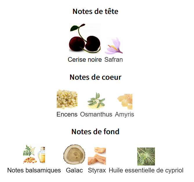 - Notes de Fond : Baume, Styrax, Cypriol, Bois de Gaïac