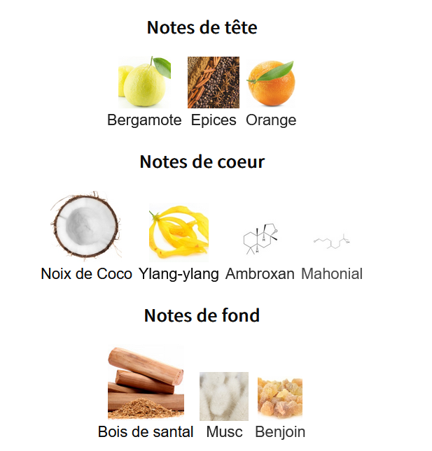 Notes de Fond : Bois de santal, Benjoin, Musc