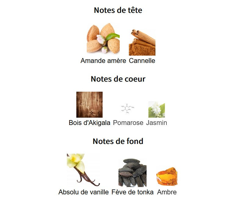- Notes de tête : cannelle et amande amère — une ouverture épicée et gourmande qui évoque chaleur et exotisme.