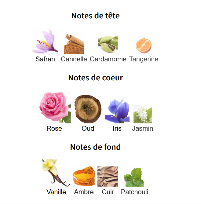 - Notes de Fond : Bois de santal, Ambre, Musc, Bois d’agar
