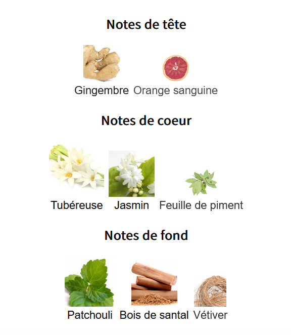 - Notes de tête : Feuille de piment, Orange sanguine