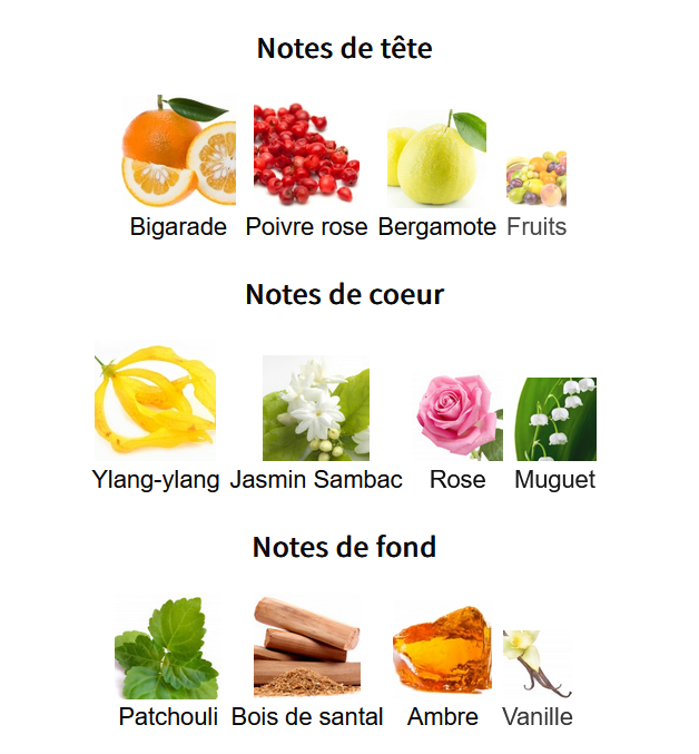 - Notes de Tête : Néroli, Bergamote, Orange, Fruits, Poivre rose