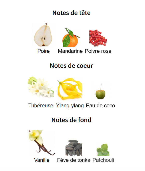 - Notes de cœur : Tubéreuse, ylang-ylang, eau de coco