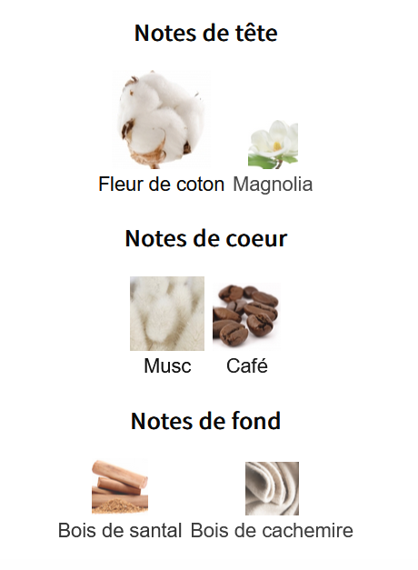 - Notes de fond : Musc, Bois de santal, Cachemire